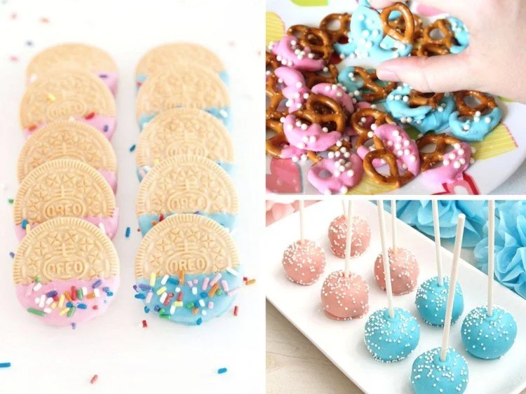 What's a party without desserts? Create a colour coordinated dessert station that not only looks good, but tastes delicious as well. It can include anything from cookies, macarons, cake pops, rice krispies or a small cake with a variety of donuts. Mini donuts are the perfect bite size dessert and are super cute too! The desserts don't necessarily need to be pink or blue, you can choose any colour scheme for your party. Black and gold is a great option for a more modern look or even white and grey. Whatever colours you choose just ensure the desserts coordinate for that extra special touch.