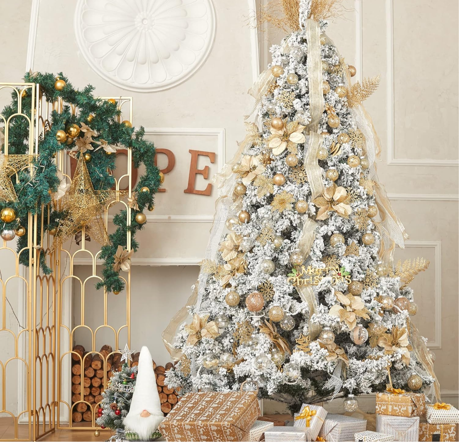 To achieve a polished look, we suggest using gold and white ornaments.
