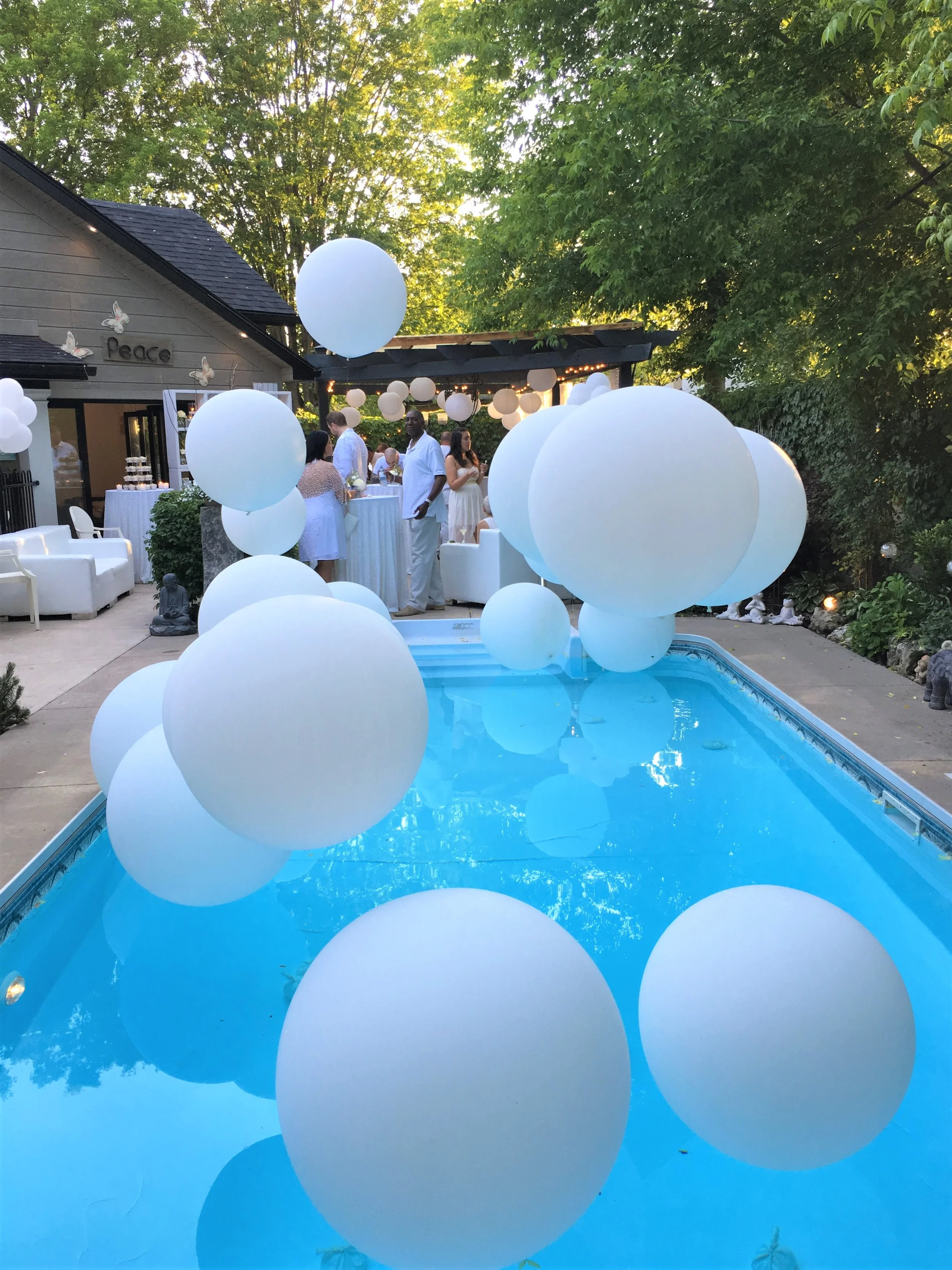 Her first request was to decorate the pool, and since balloons are all the craze right now, we knew that this would be perfect for that added chic touch. We contacted the lovely ladies at Luxe Balloon and they provided 18 over-sized balloons (it was a mix between 30″ and 36″) that were both helium and air filled (6). Our balloon dreams came true!